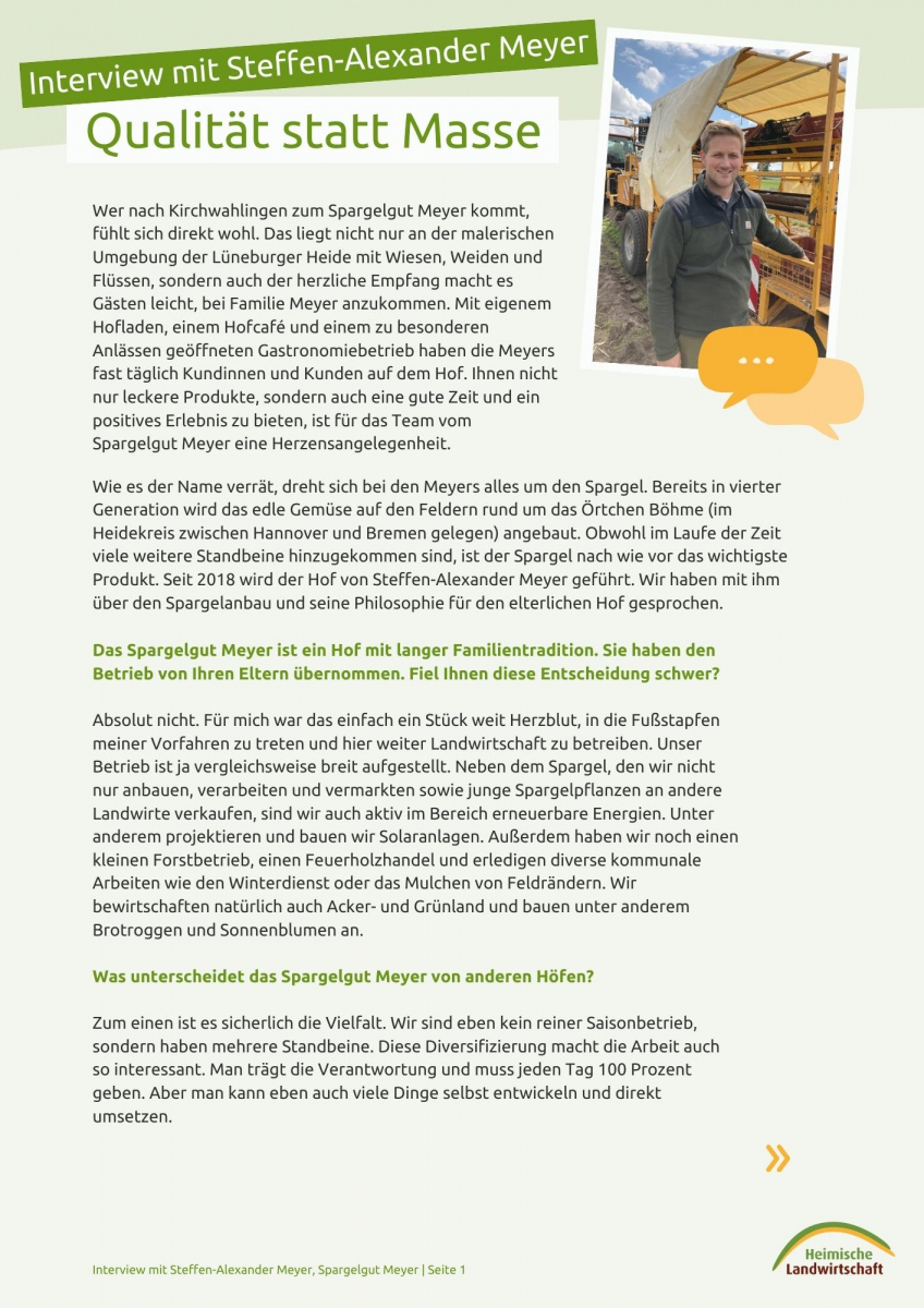 Wie es der Name verrät, dreht sich bei den Meyers alles um den Spargel. Bereits in vierter Generation wird das edle Gemüse auf den Feldern rund um das Örtchen Böhme (im Heidekreis zwischen Hannover und Bremen gelegen) angebaut. Obwohl im Laufe der Zeit viele weitere Standbeine hinzugekommen sind, ist der Spargel nach wie vor das wichtigste Produkt. Seit 2018 wird der Hof von Steffen-Alexander Meyer geführt. Wir haben mit ihm über den Spargelanbau und seine Philosophie für den elterlichen Hof gesprochen.